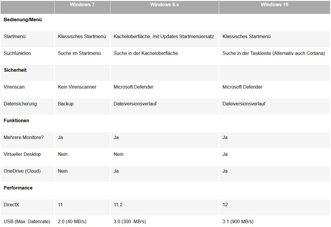 While DirectX 11 is still installed on Windows 7, Windows 8 and 10 come with DirectX 11.2 and 12. There are also some differences in the supported USB versions. Windows 7 still works with 2.0, Windows 8 and 10 support USB 3.0 and 3.1. This allows higher data rates, so files are copied back and forth to your USB medium or device faster.