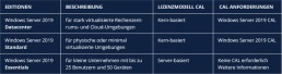 The most basic and affordable version of the operating system is the Windows Server Essentials version. While the feature set of Standard and Datacenter is very similar, Microsoft has programmed the Essentials variant with a reduced feature set and a small number of possible licensing options. This version is thus specifically tailored to small organisations and companies. Compared to Windows Server 2016 Essentials, the new version has been significantly improved, especially in the areas of „hybrid scenarios, „application innovation“, „hyper-converged infrastructure“ and „security“. Virtual networks can now be encrypted more easily with Microsoft’s Encrypted Networks and protected more reliably against forgery and eavesdropping attempts. Access to a network running Windows Server 2019 is automatically limited to 25 users and 50 devices. An organisation can only run one server with this operating system, as the Essentials Server must also be the domain controller. Therefore, this version is not interesting for institutions with more than 25 employees.